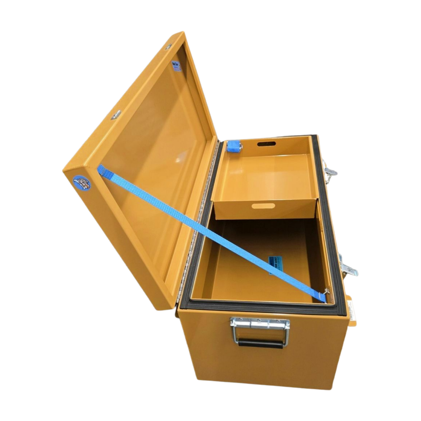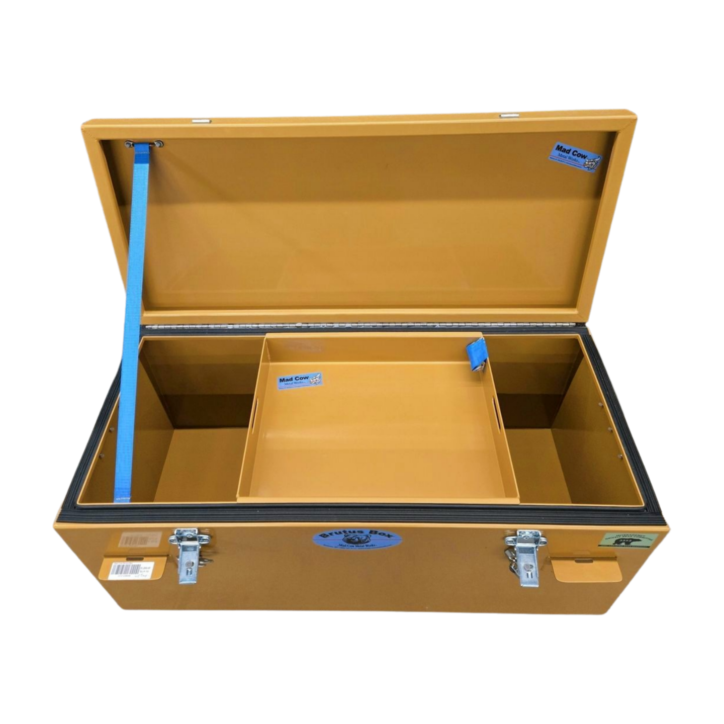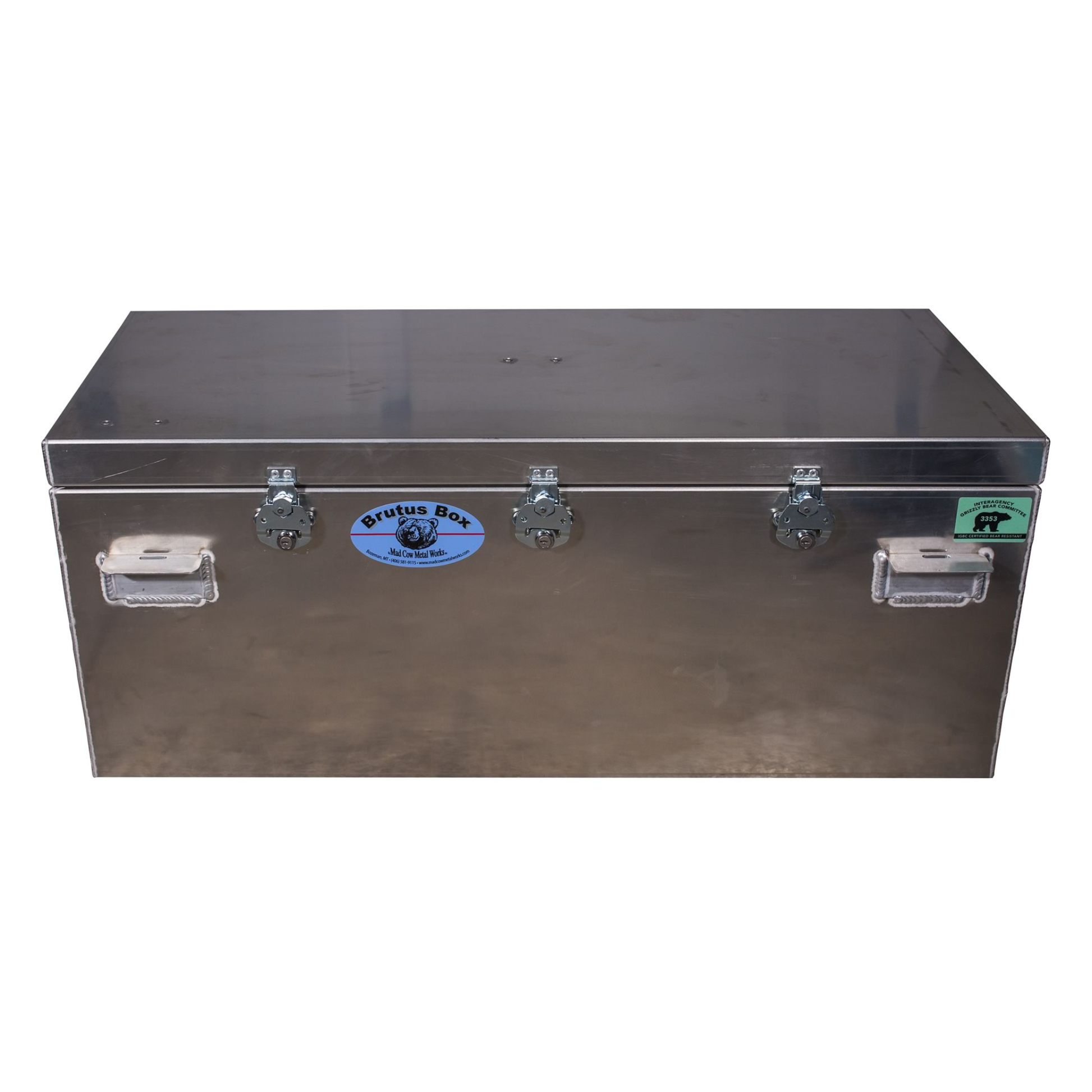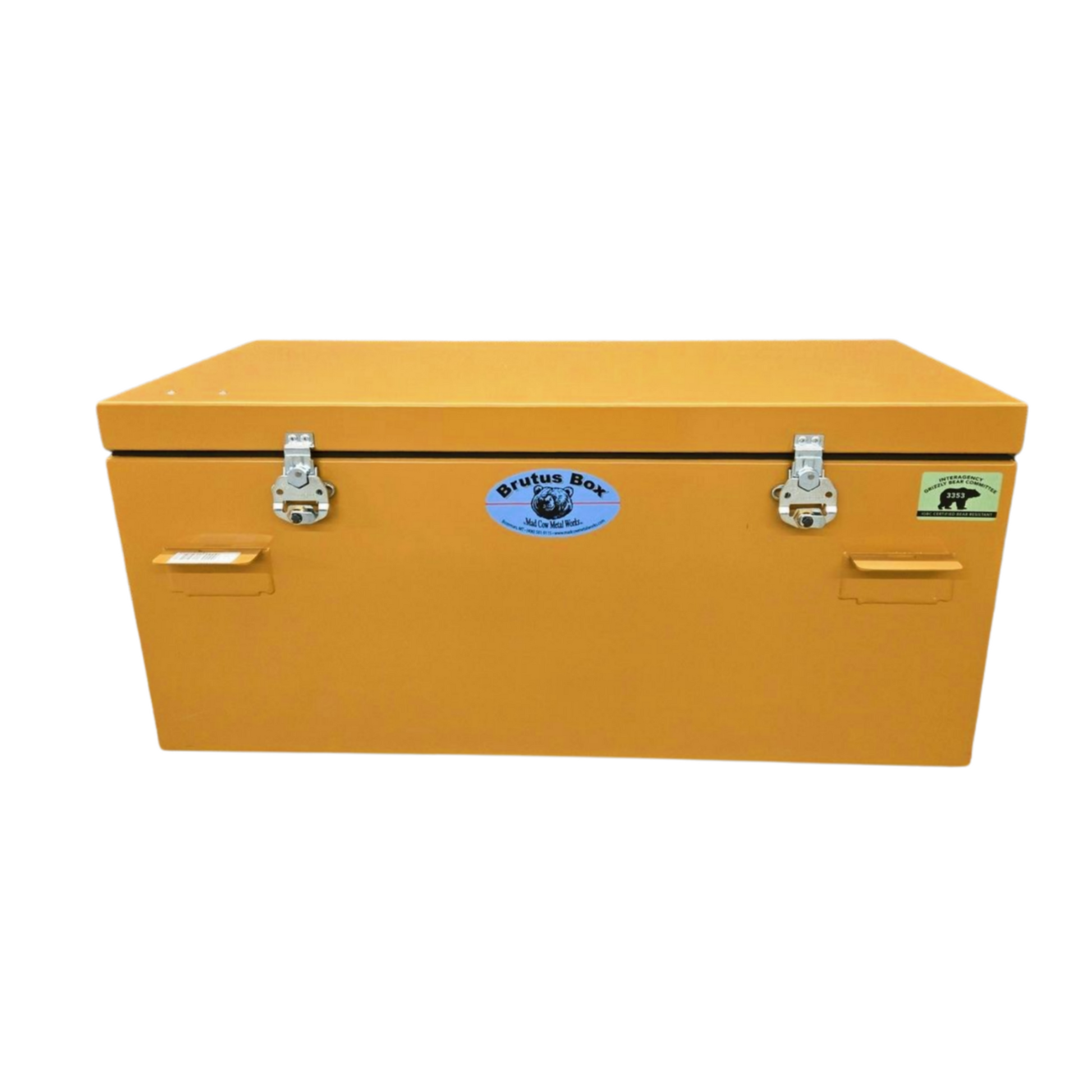Boxes are built with .100 gauge aluminum, robust can-jar latches, full-length stainless steel hinges, spring-loaded handles, 1″ slots in tabs for easy strap down, and rubber gaskets. Brutus boxes have key lockable latches, a welded channel “stiffener” inside/across the box front, and the IGBC certified sticker. These boxes have been tested with many different bears and meet all IGBC bear-resistant design and structural standards. Mad Cow boxes are water resistant and built to last. Brutus boxes are also available without tabs for car camping and food storage in bear country.