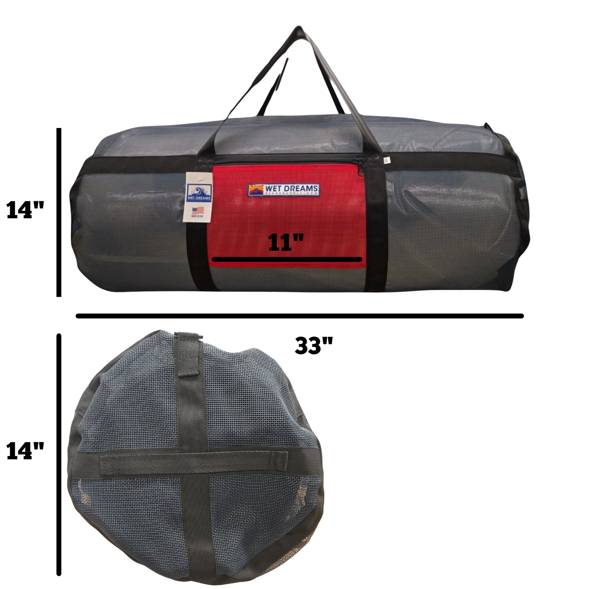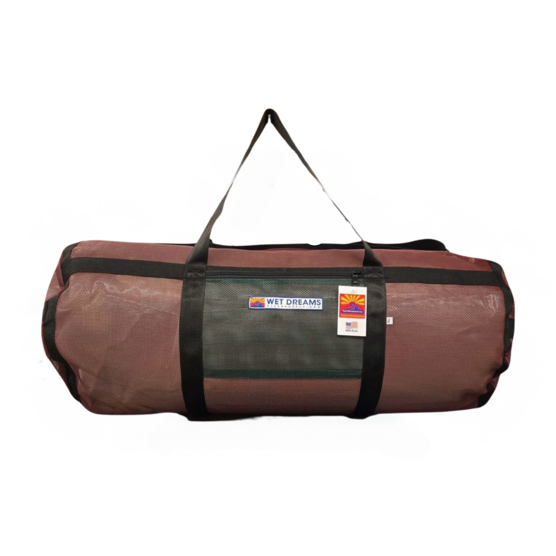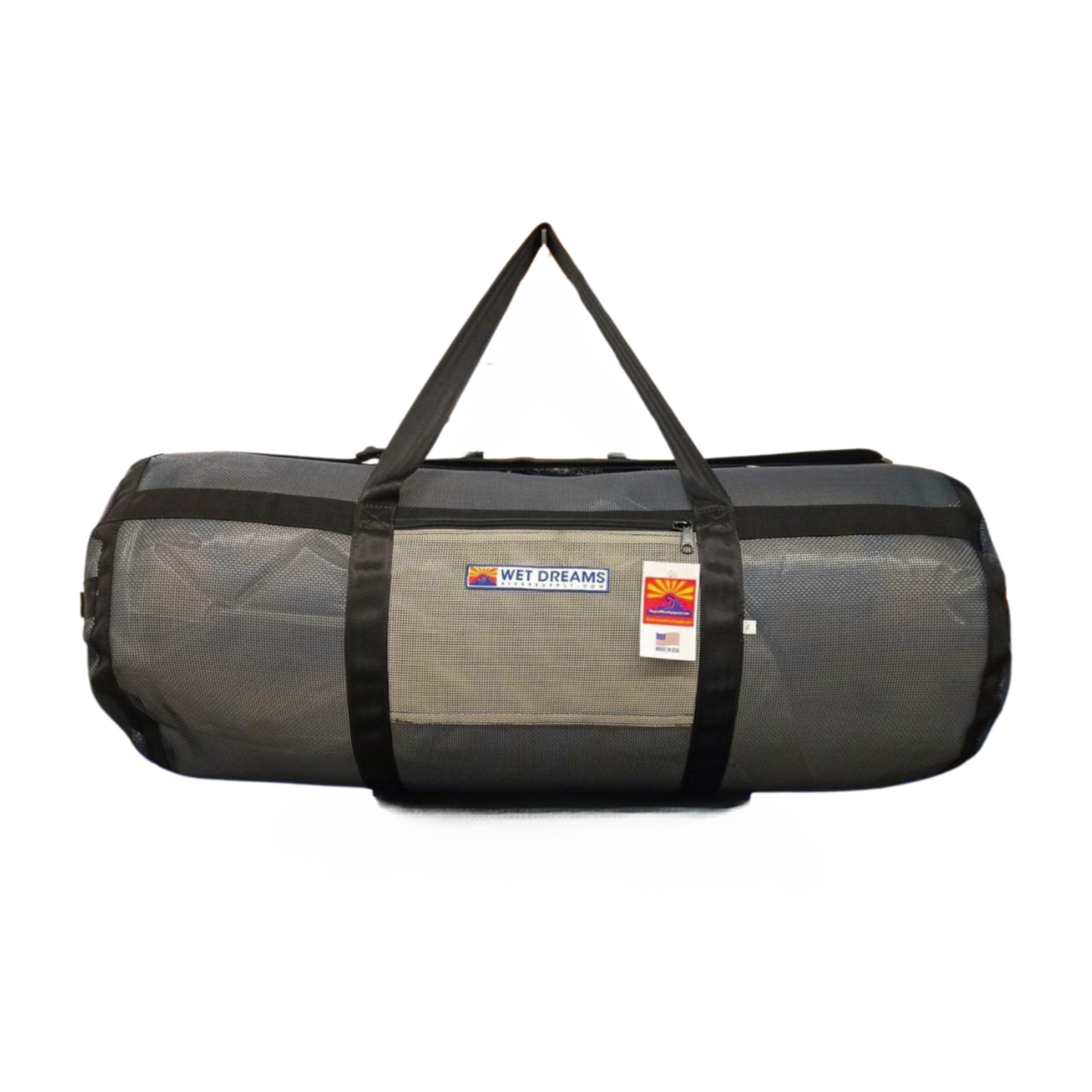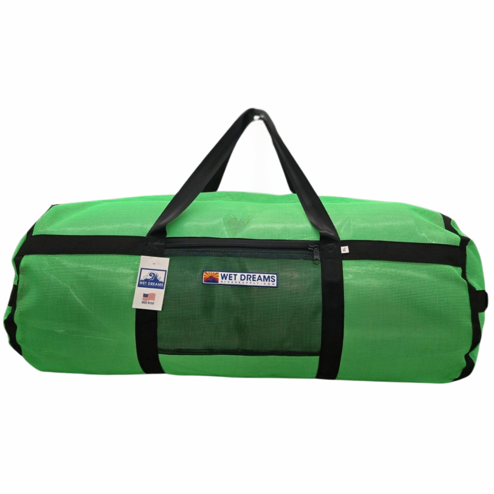 Wet Dreams Rig Bags are built from vinyl coated mesh and have handles on both round ends. Burly #10 zippers with 2 slides and 1.5 inch seat belt webbing carry handles. The Rig Bag XL features a zippered pocket on the front to stash small items.
