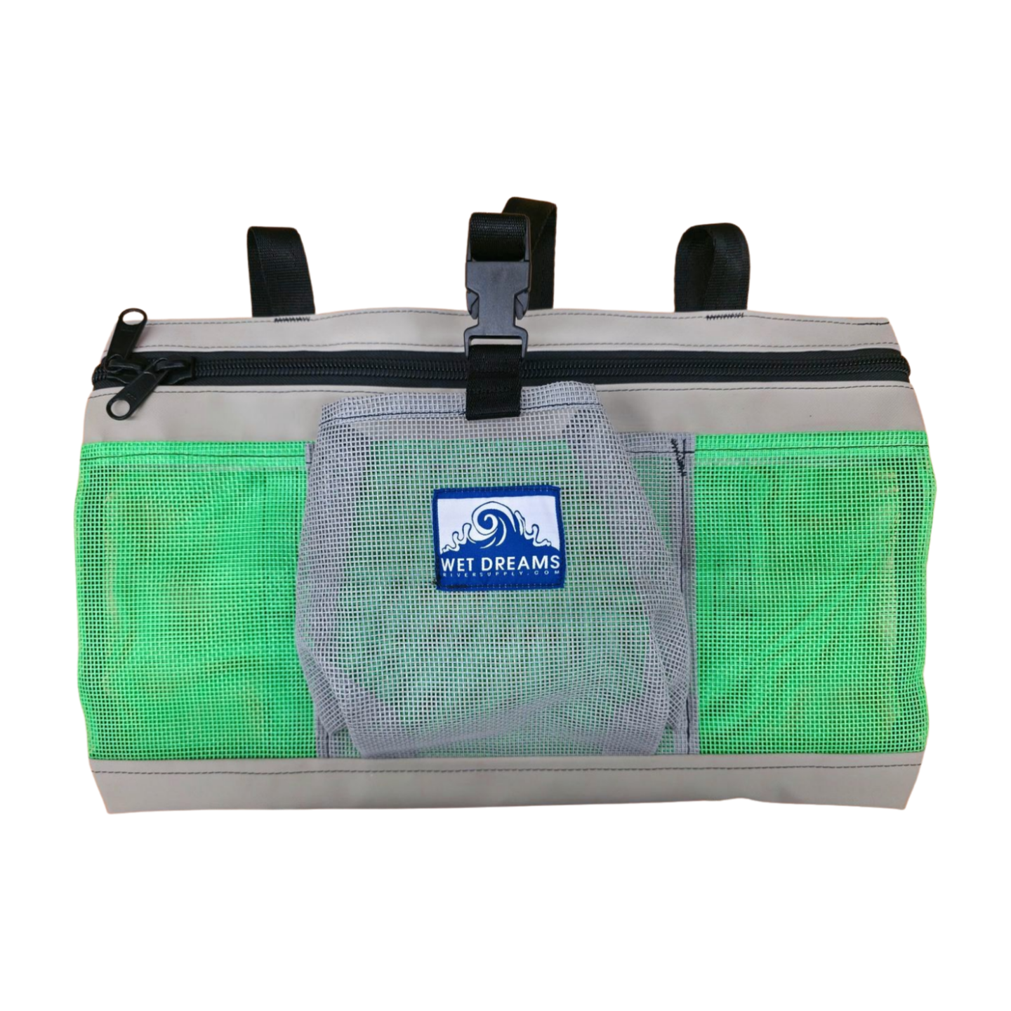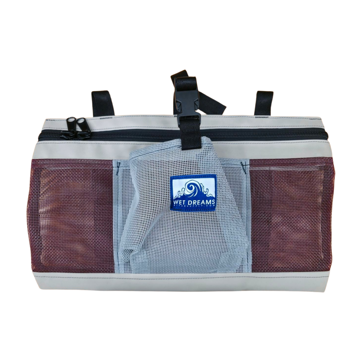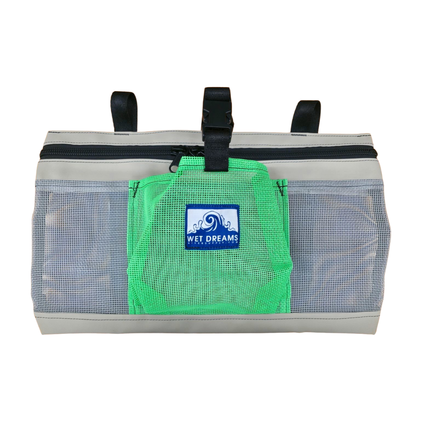 FRESH UPDATE! Redesigned for the 2026 season: Now sturdier than ever! We heard your feedback and have beefed up the upper and lower edges with Hypalon and added two eyelets to the bottom for draining! One of our most popular bags for oar frames, the Zippered Junk Drawer is ideal for any rowers compartment. Hang behind your knees for easy access to sunscreen, soap, hand sanitizer, gloves, frame tools, river maps, etc... Fits the commonly used larger RiverMaps. 18"x12" with 8"x6" front open pocket, #10 zipper, Rear cam buckle attachment. 1" side release buckle for open pocket, Vinyl coated mesh with webbing reinforced base.
