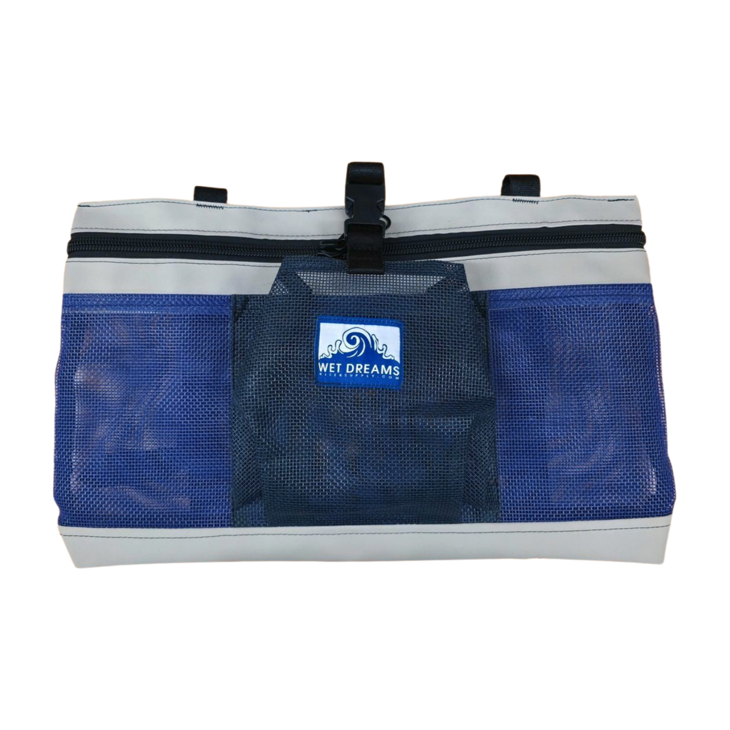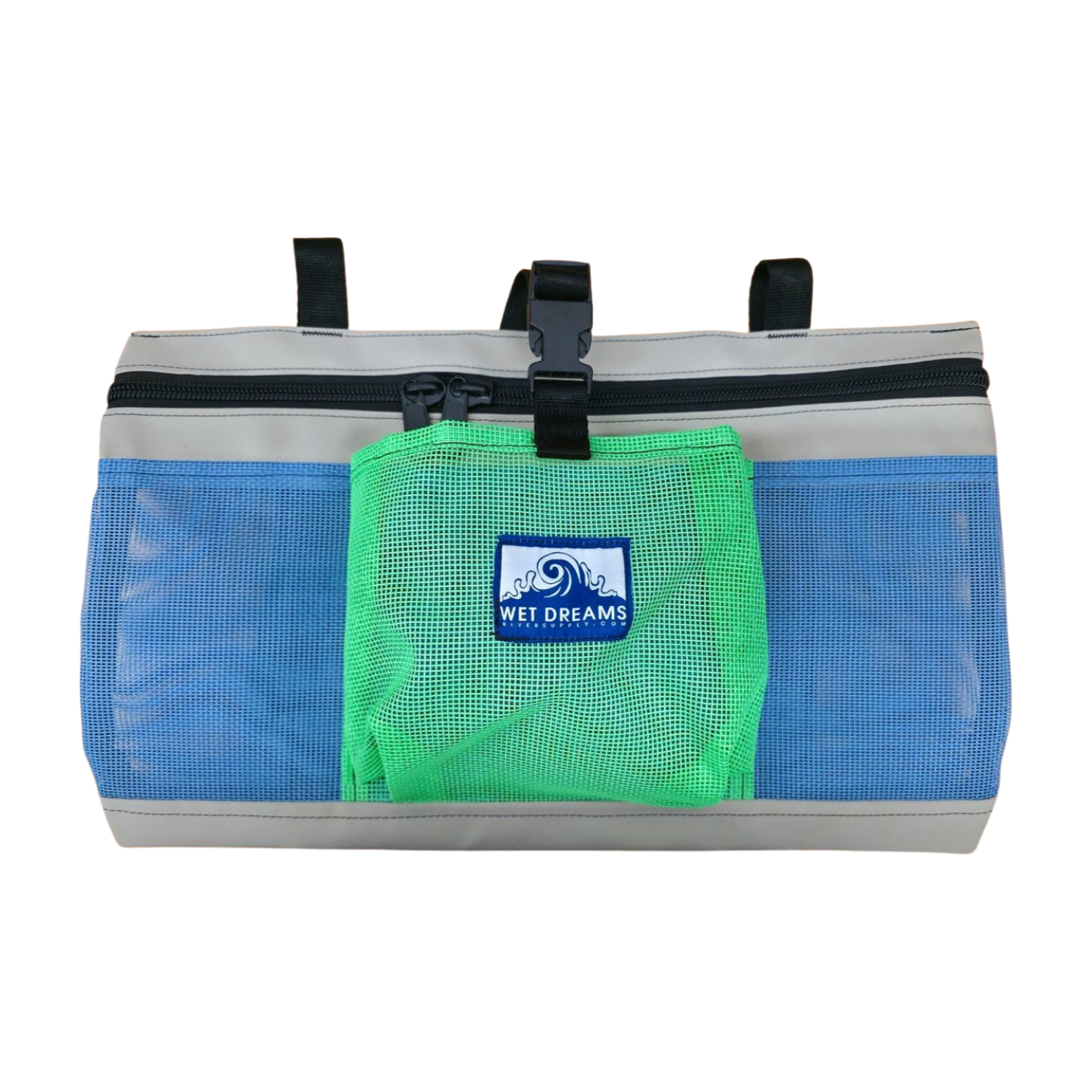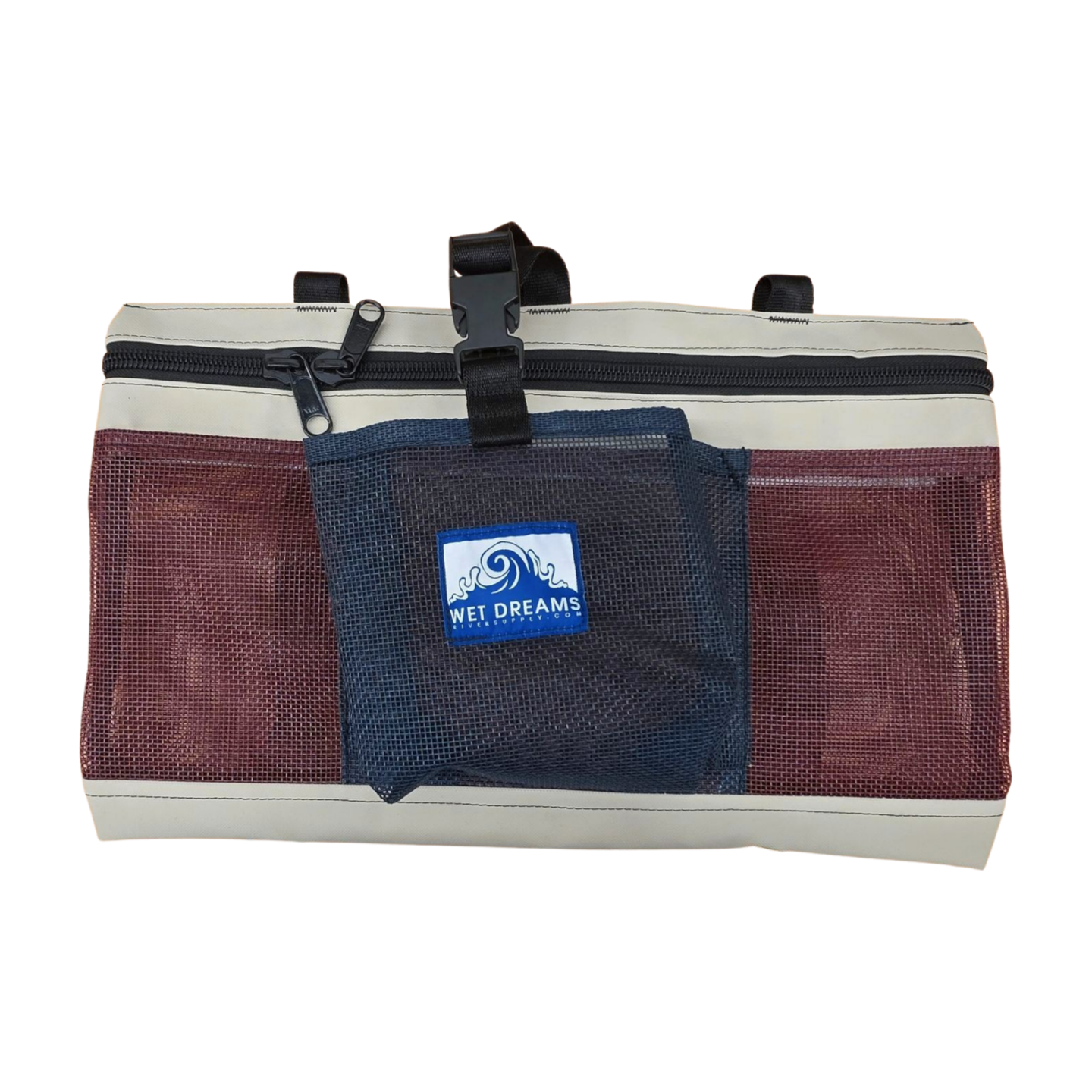 FRESH UPDATE! Redesigned for the 2026 season: Now sturdier than ever! We heard your feedback and have beefed up the upper and lower edges with Hypalon and added two eyelets to the bottom for draining! One of our most popular bags for oar frames, the Zippered Junk Drawer is ideal for any rowers compartment. Hang behind your knees for easy access to sunscreen, soap, hand sanitizer, gloves, frame tools, river maps, etc... Fits the commonly used larger RiverMaps. 18"x12" with 8"x6" front open pocket, #10 zipper, Rear cam buckle attachment. 1" side release buckle for open pocket, Vinyl coated mesh with webbing reinforced base.